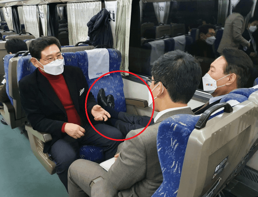 한 때 난리가 났었던 윤석열 후보가 기차 좌석에 구두를 신고 발을 올린 사진