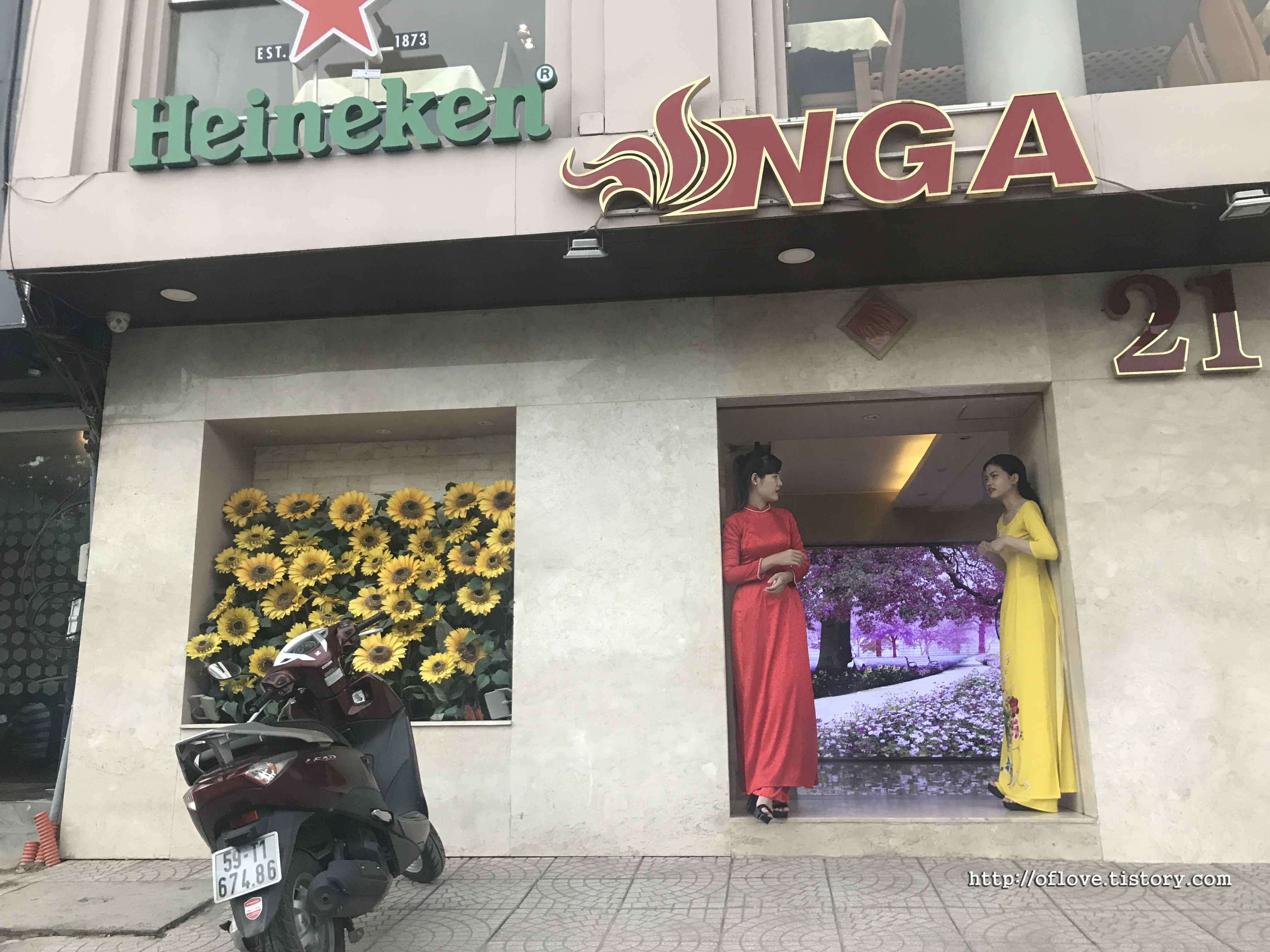 약속장소로 이동 중에 전통의상 아오자이를 입고 문 앞에 서있는 여자들이 보인다